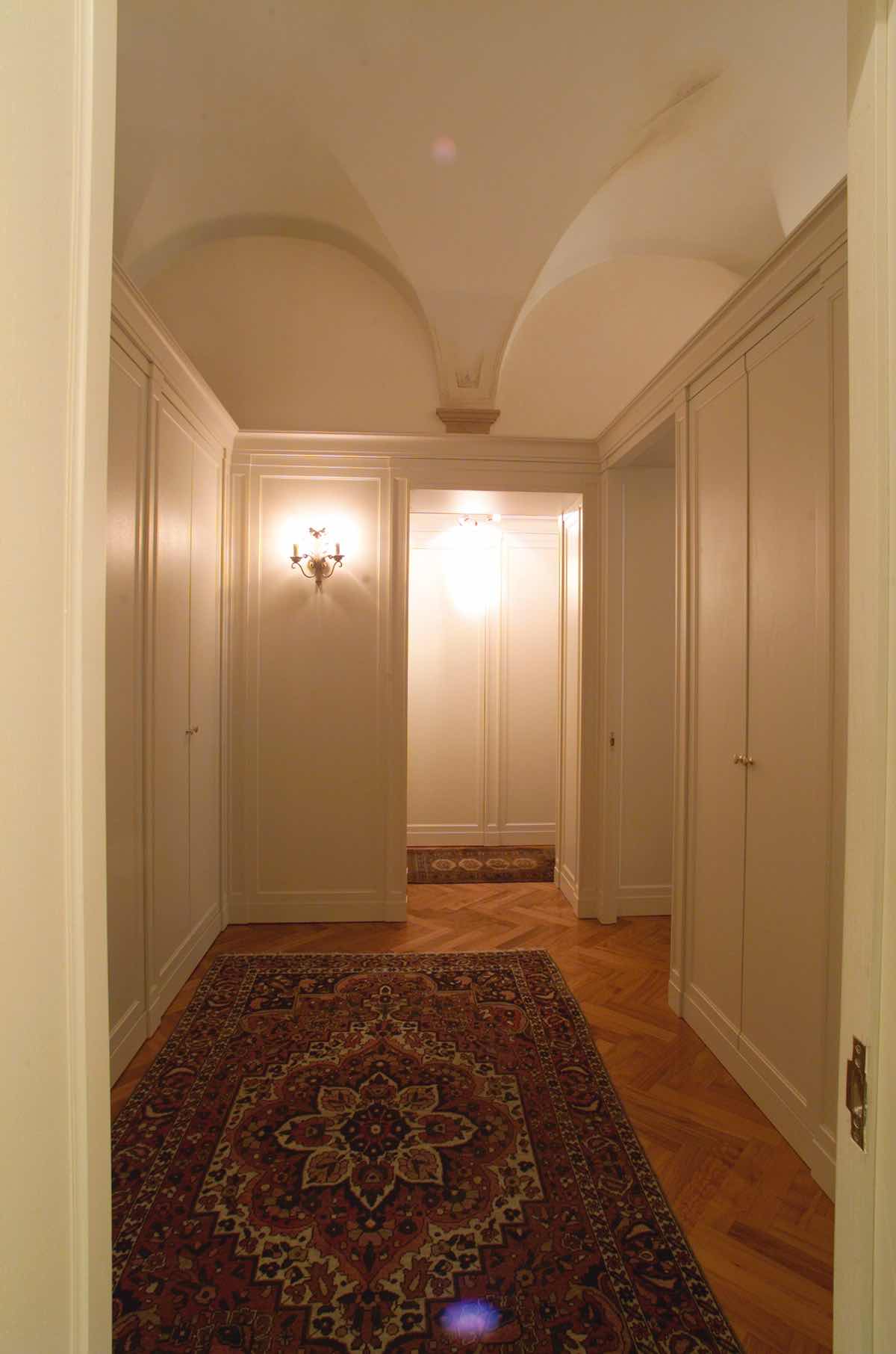 Located in a historic building in central Padua, this residential project features bespoke walnut furnishings across bedrooms, kitchen, and communal areas.