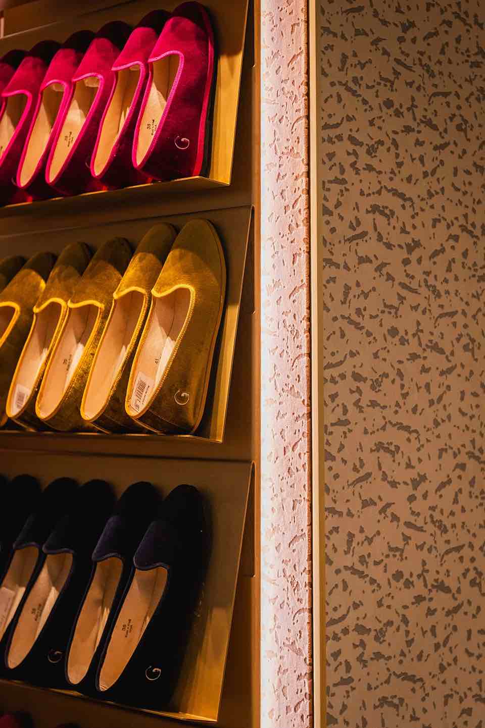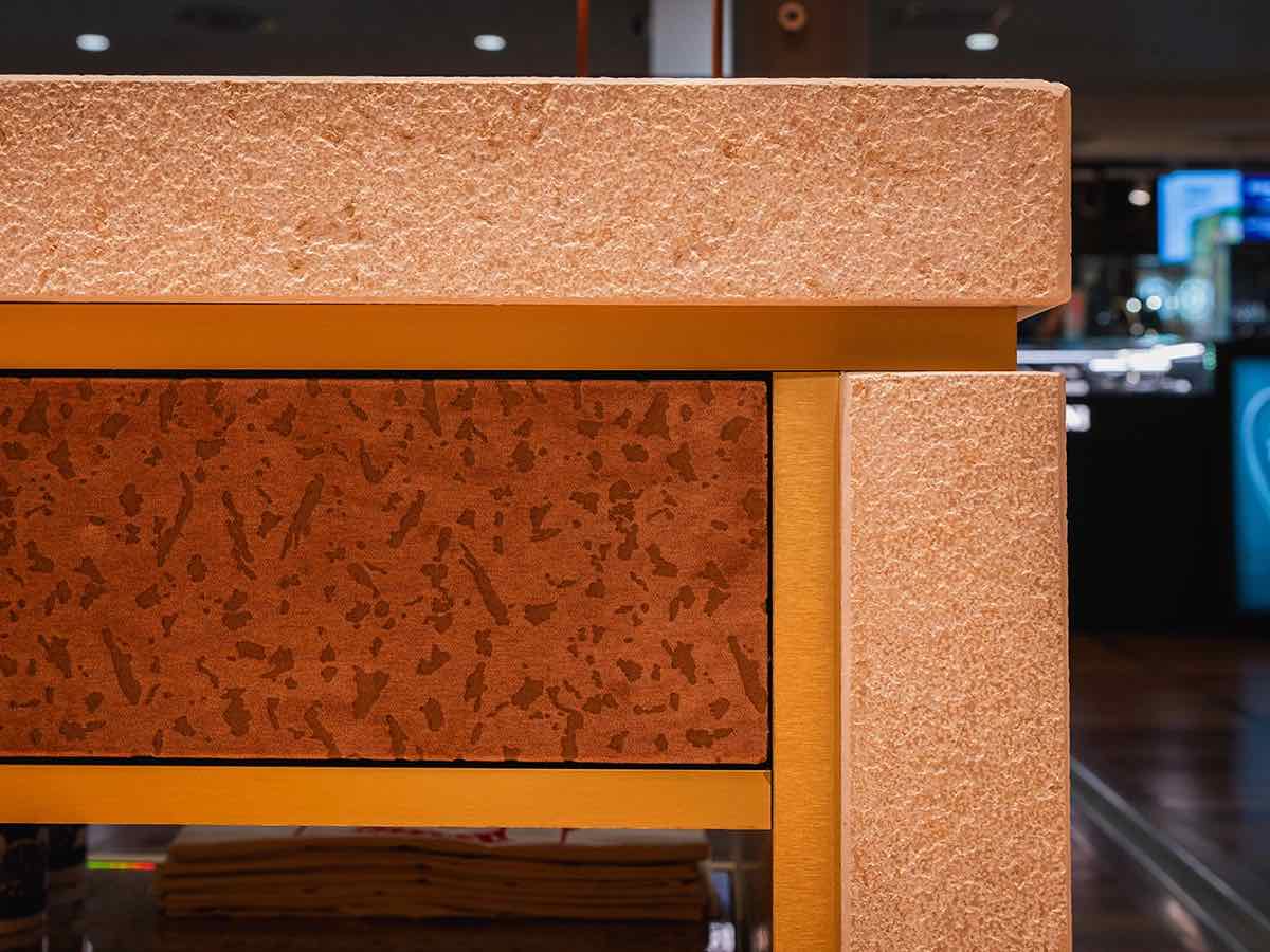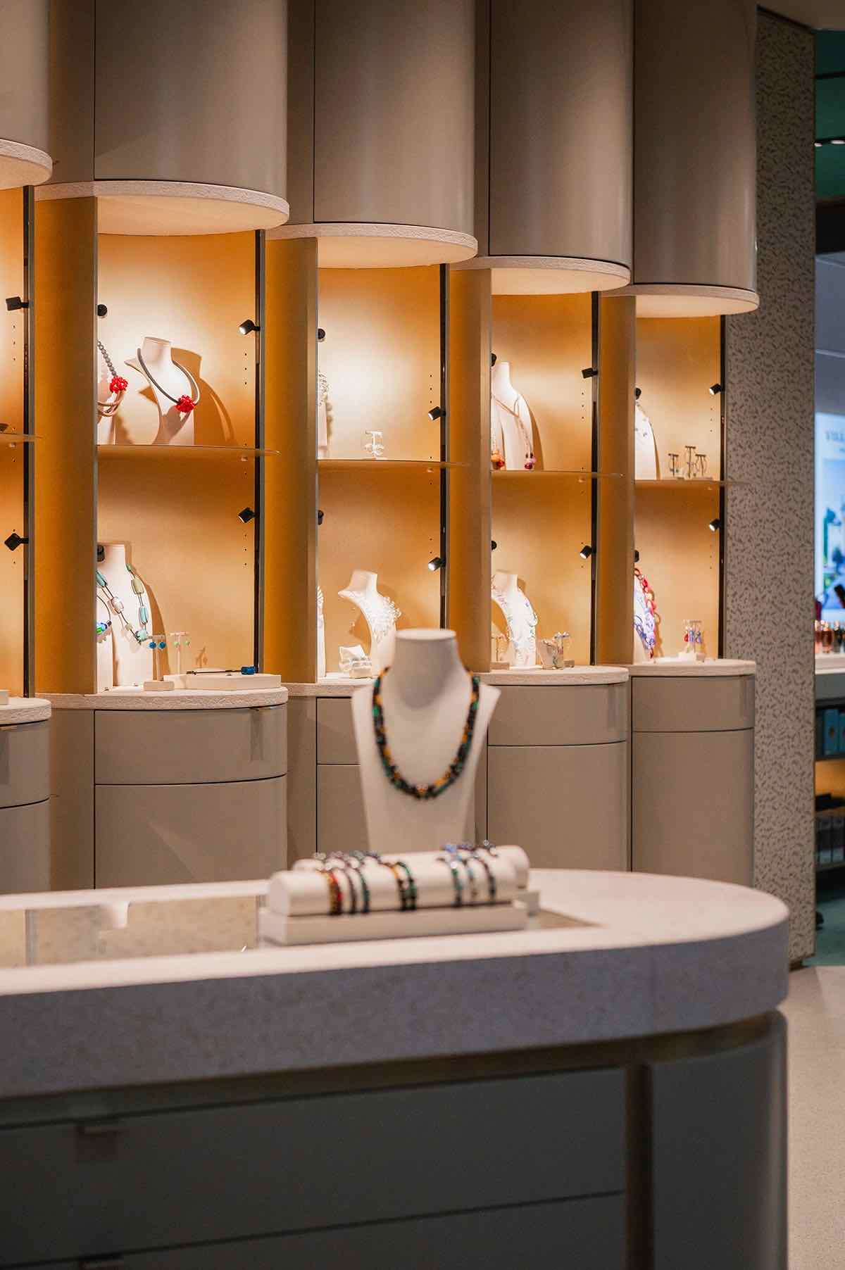 Central counters crafted from bush-hammered Istrian stone anchor the space, combining strength with understated elegance. Historically used in Venetian architecture, the textured surfaces provide a tactile reference to craftsmanship and raw materials. These stone volumes not only support displays but also create a grounded, harmonious foundation, enhancing the dialogue between materiality and space.