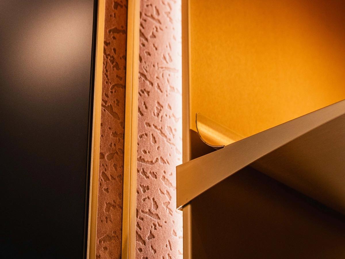 Custom display structures are crafted from metal with a bronzed brass galvanic finish, combining elegance and lightness. Integrated lighting is discreetly embedded within the frames, casting a soft, focused glow that enhances products and materials. Whether linear or curved, these elements adapt to diverse layouts while maintaining a refined and cohesive visual identity.