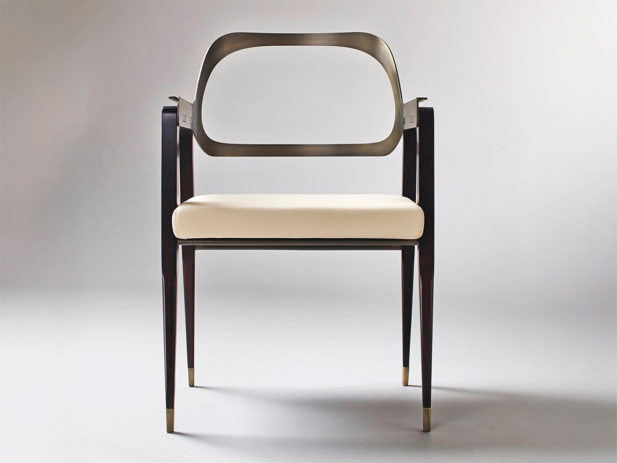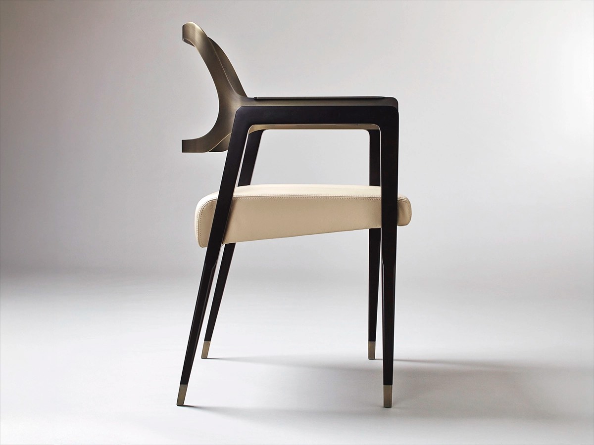 The Carlton Chair by Rossato combines the solidity of burnished brass metal with the warmth of stained walnut wood and the softness of pale cream leather. Stripped to its essential elements, it reveals its purest form, defining elegance as a continuous pursuit of simplicity and refined craftsmanship.