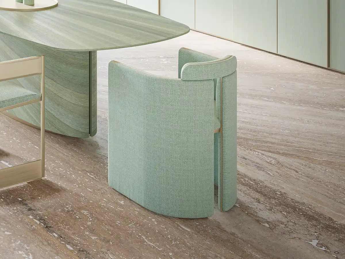 The Giulietta Chair – Dress by Rossato presents balanced solids and voids, curved construction lines with premium textile, and brushed gentle gold metal. Upholstered in Acqua-colored viscose and linen fabric, it merges structural precision with tactile comfort, achieving an effortless balance between form, function, and refined elegance.