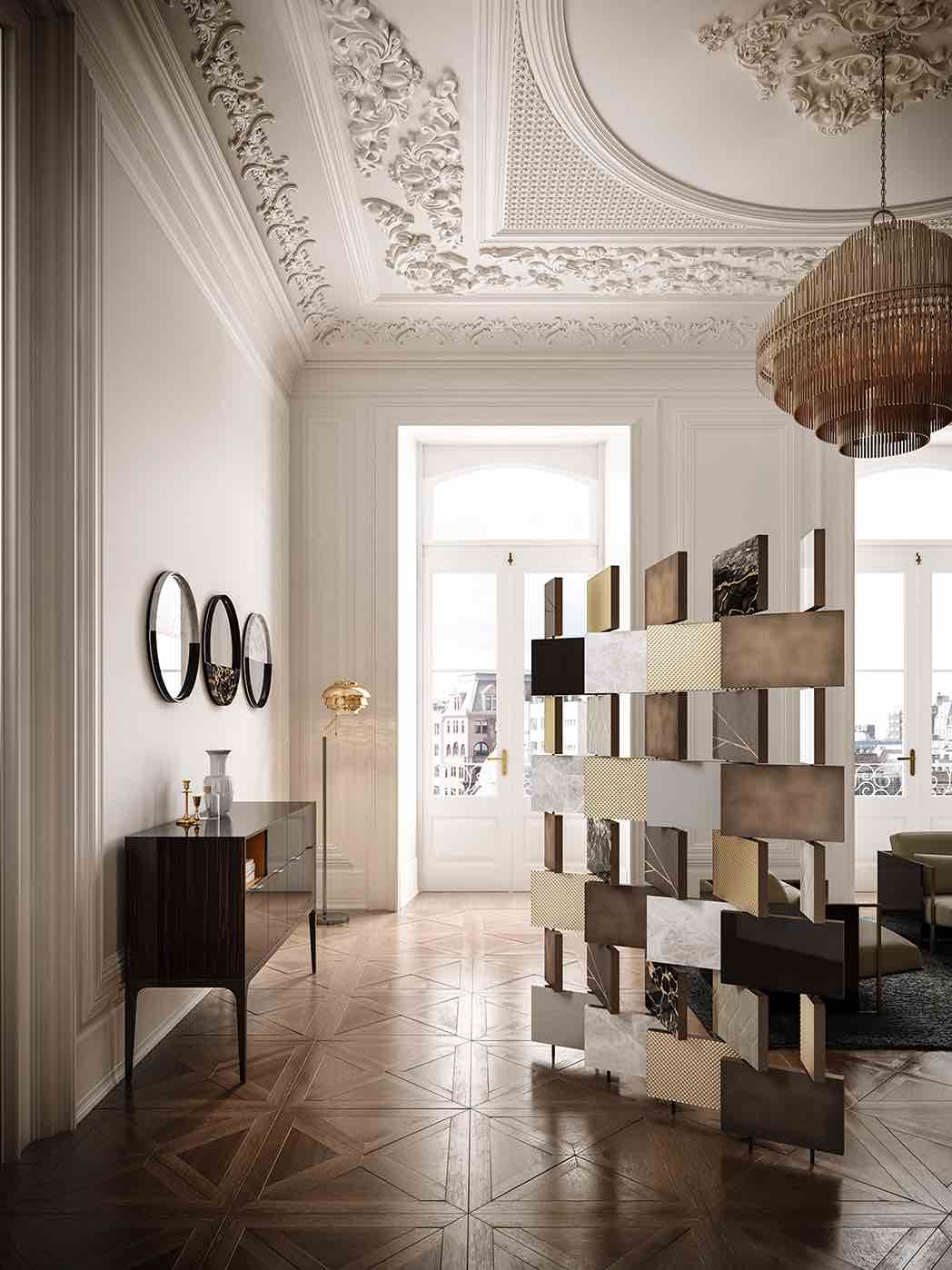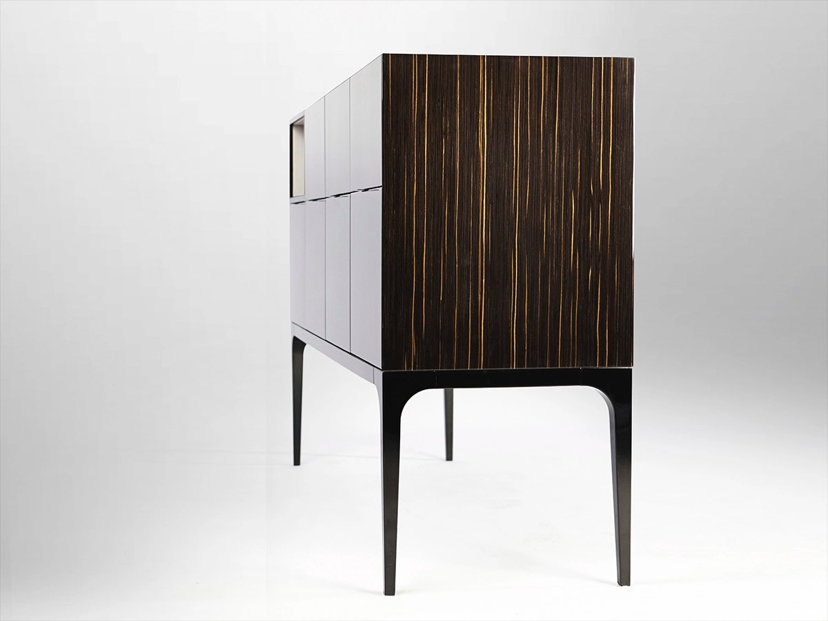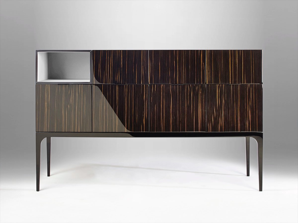 The Fondaco Console Table by Rossato combines a sleek ebony-wood veneer structure with seven drawers and an open niche covered in white leather. Its supporting frame in glossy nickel metal unites functionality and refined elegance, offering versatile placement while conveying a balanced dialogue between materials and contemporary design.