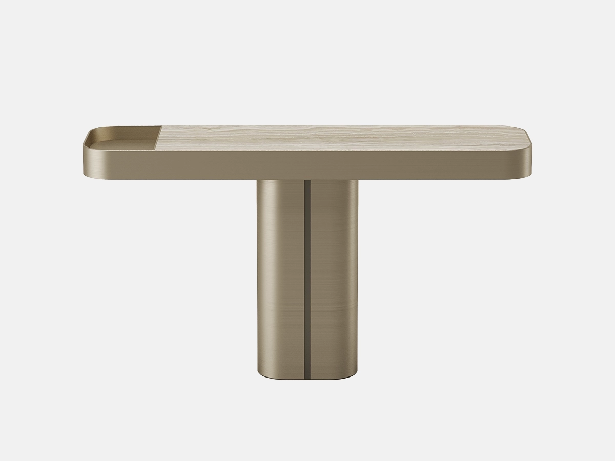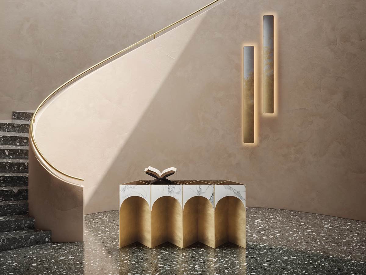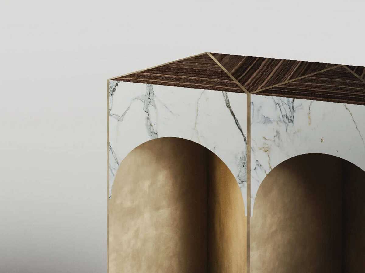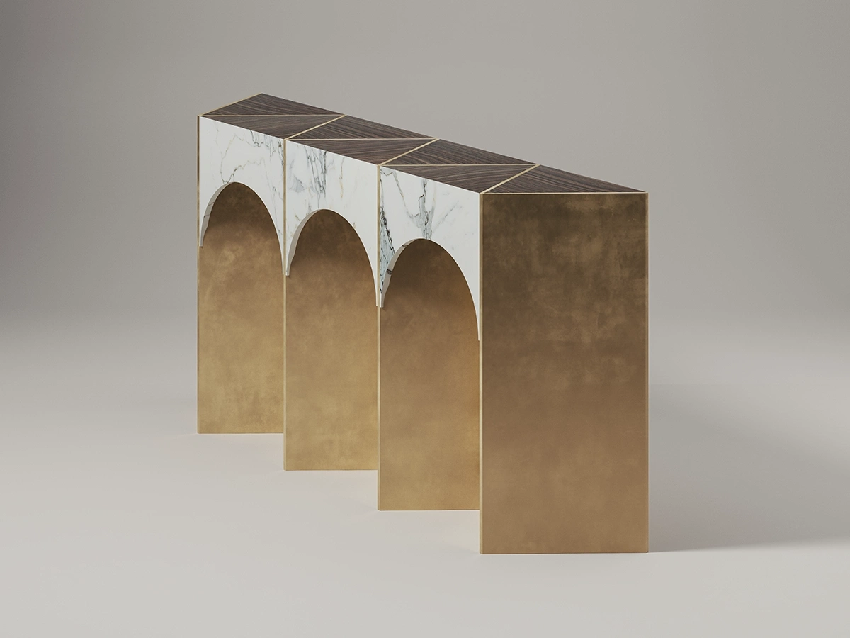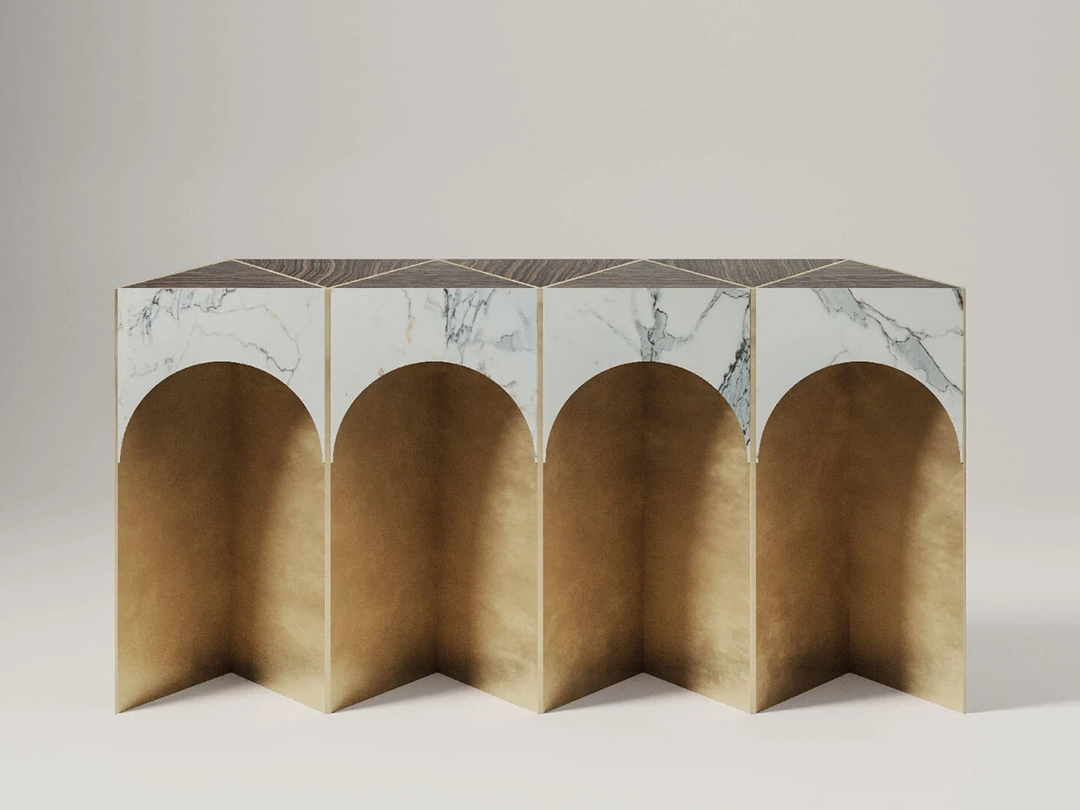 The Malibran Console by Rossato combines essential lines and arched geometry in Carrara marble and Eramosa stone with an antique brass metal base. Its modular arches and zigzagging base create a dialogue of marble, wood, and metal, balancing proportions and refined finishes to evoke serene, luxurious elegance.
