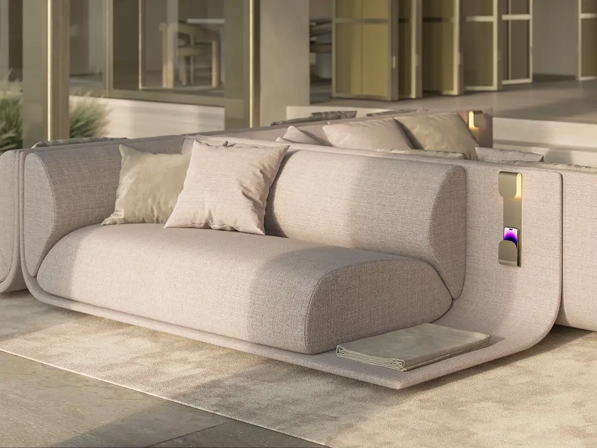 The Marsilio Sectional Sofa by Rossato features a flexible modular concept that supports varied uses, crafted with brushed gold metal, Perla viscose-linen upholstery, and Travertino Romano Classico stone. Its discreet lighting and wireless charging are seamlessly integrated, pairing modern technology with elevated comfort.