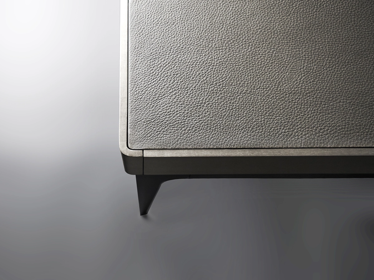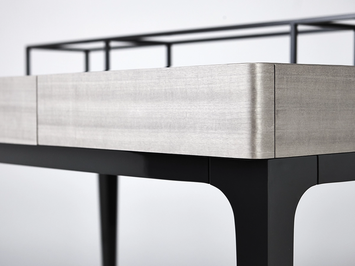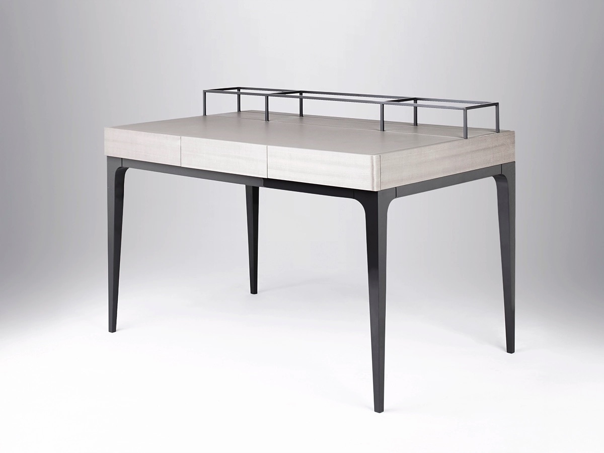 The Hemingway Desk by Rossato presents a balanced design that reinterprets simplicity through precise details and tactile richness. The grey-stained maple veneer and hammered leather top add warmth and texture, while the glossy nickel frame and subtle grid motif complete a composition that brings quiet elegance and calm focus to any room.