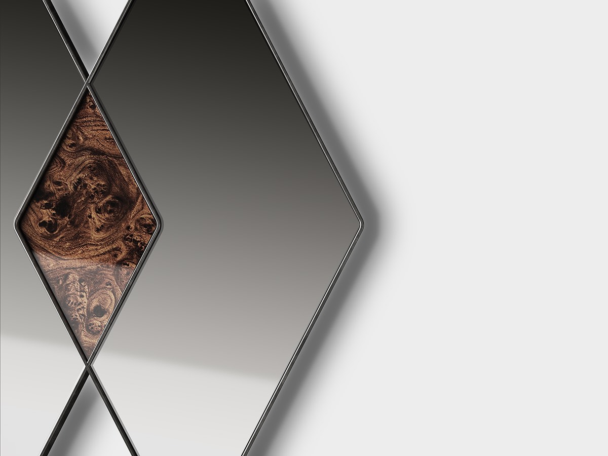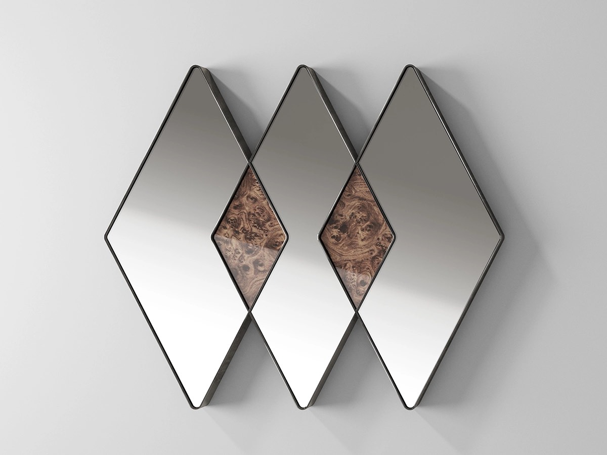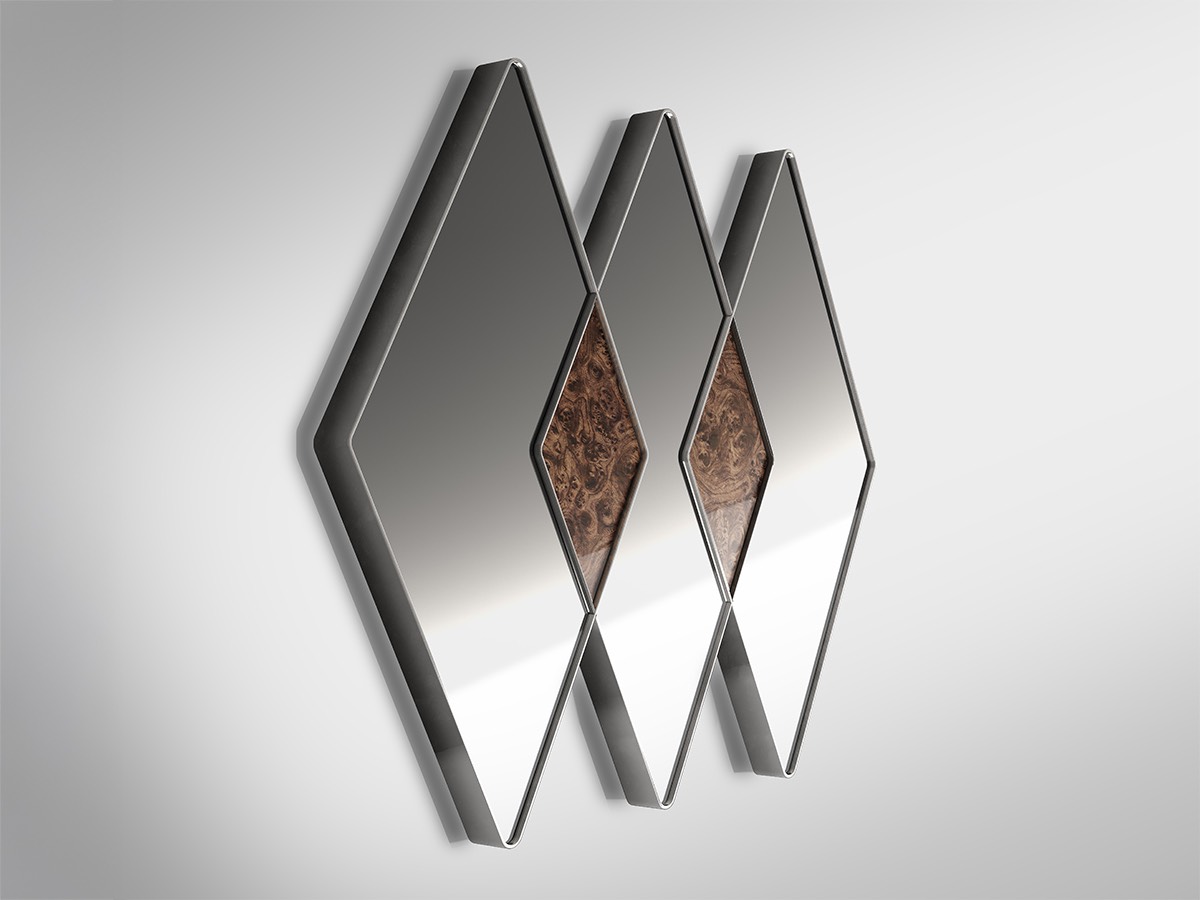 The Manin Mirror by Rossato features interlacing mirrored and wood surfaces that transform it into a decorative composition. Brushed-nickel metal and light burl wood highlight the geometric rhythm of its lines, creating a piece that enhances interiors and contributes to the creation of exclusive, refined spaces.