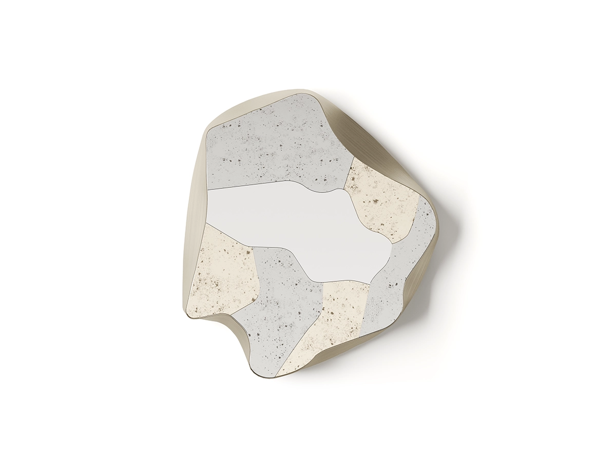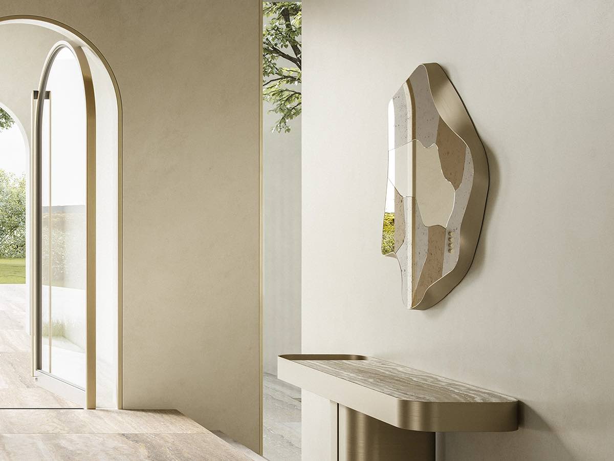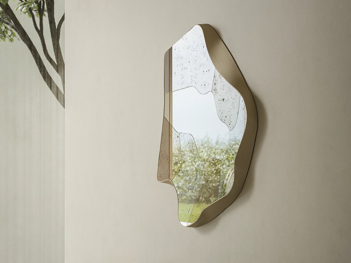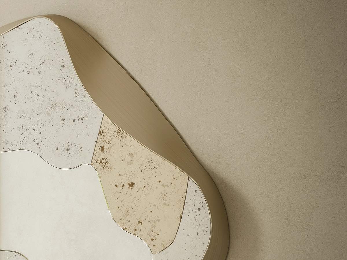 The Zenobio Mirror by Rossato combines softly irregular contours and minimalist lines with delicately beveled edges, crafted in antiqued Bianco e Nero or Bianco e Nero Bronzo glass with a brushed gentle gold frame. Each piece reflects Venetian artistry in a refined expression of elegance and balance.