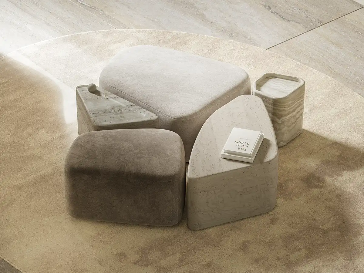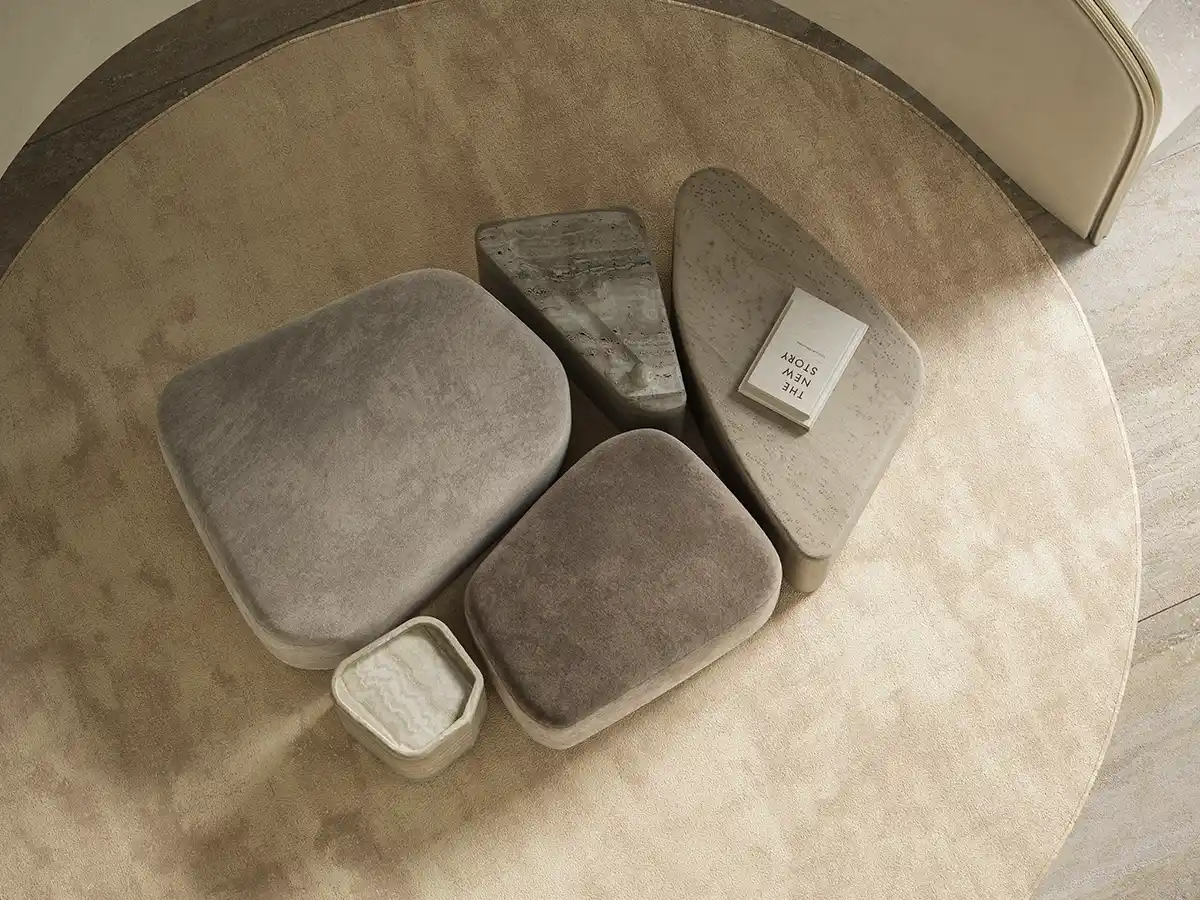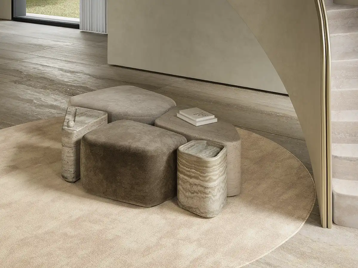 The Fenice Large Pouf by Rossato features a modular, rounded form, adaptable for indoor or outdoor spaces, with brushed gentle gold metal, upholstered in Avorio silk velvet. Inspired by stone, its composition evokes the irregular beauty of Palladian floors, where fragments unite into a seamless, functional, and elegant whole.
