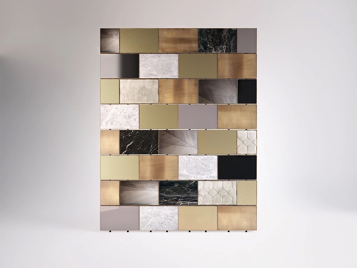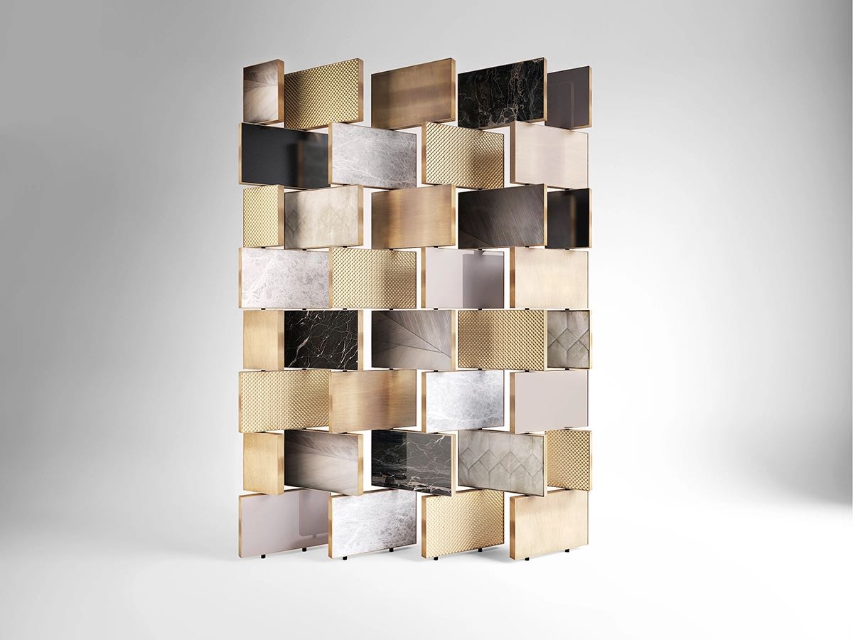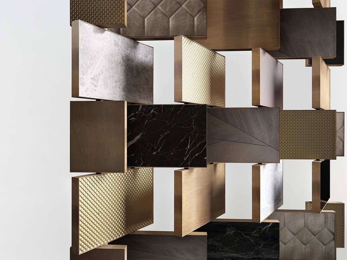 The Clemente 1 Room Divider by Rossato reveals a refined mosaic of textures and tones: Portoro and silver marble, knurled brass, walnut and grey patterned wood, platinum-finished metal, and padded ivory suede with stitched motifs. Its layered composition conveys harmony and distinction, enhancing interiors with a sense of quiet balance.
