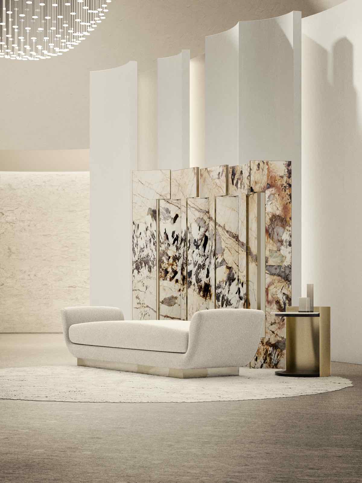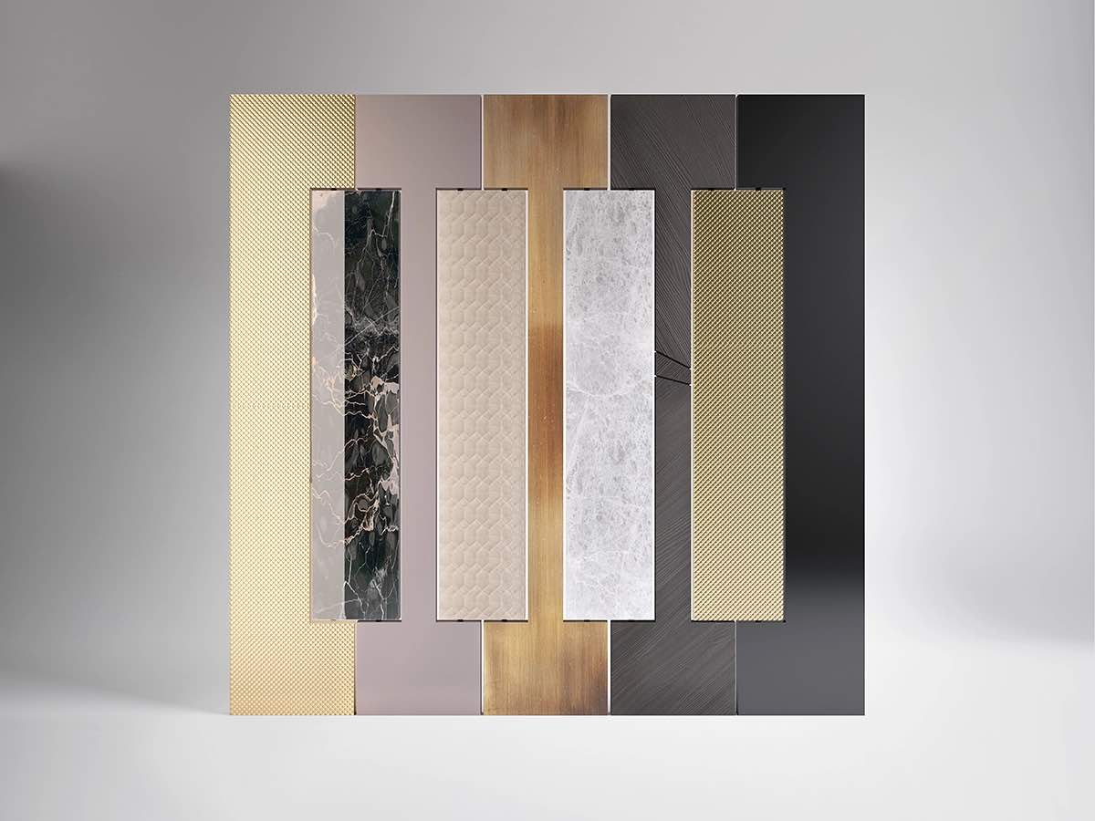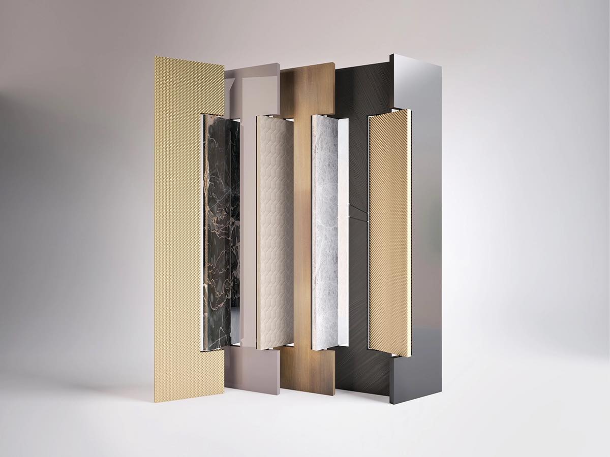 The Clemente 2 Room Divider by Rossato presents a layered arrangement of vertical components, combining platinum-finished metal, padded ivory suede with stitched motifs, walnut and grey patterned wood, knurled brass, and Portoro and silver marble. This composition creates subtle harmony and elegance, enhancing interiors with refined balance and visual distinction.
