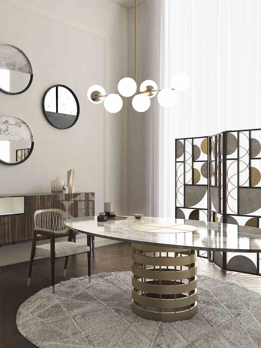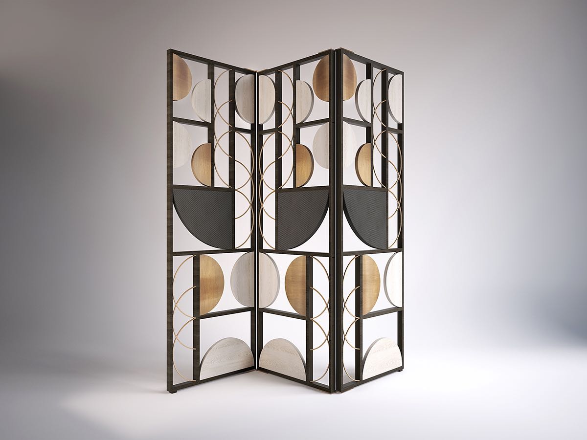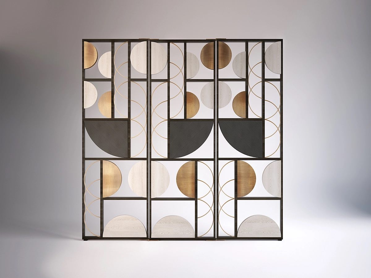 The Tiffany Room Divider by Rossato features a screen that both unites and separates, combining embroidered fabric with a contrast of solid and open volumes. Anchored by burnished metal plates, and enriched with oak veneer, woven leather panels, and Travertino stone, it creates a composition that celebrates subtle and refined craftsmanship.