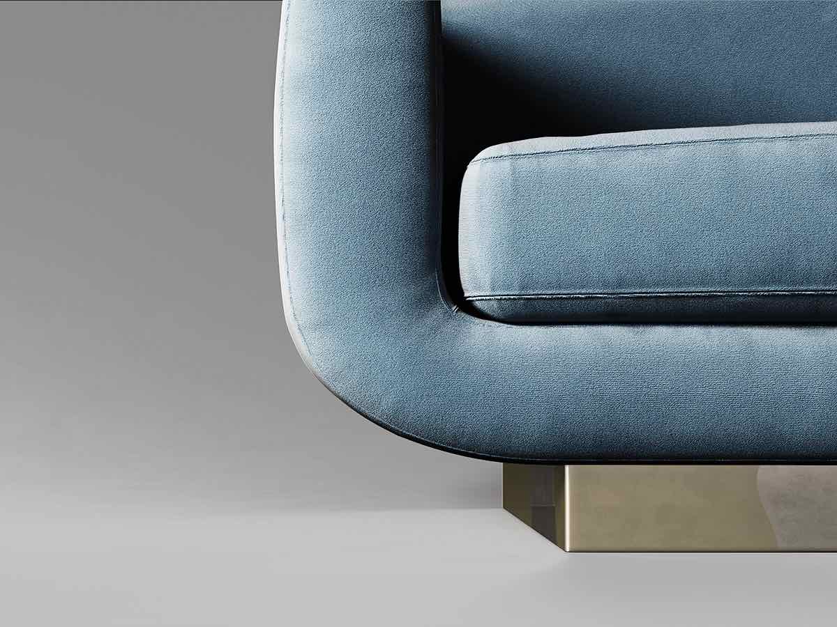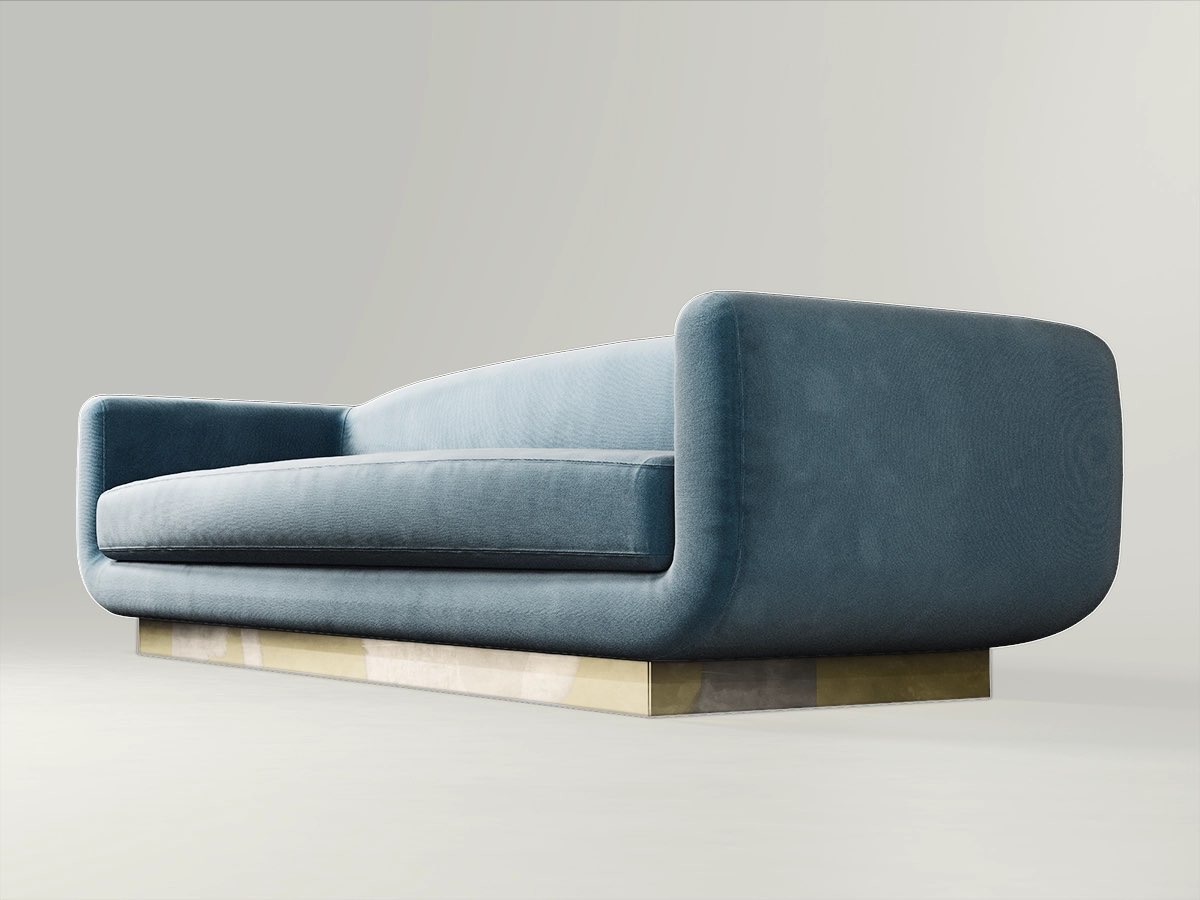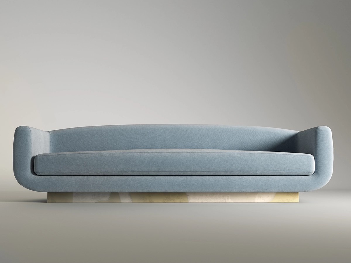 The Keaton Straight Sofa by Rossato combines an iconic, timeless shape with an enveloping, sophisticated form. A classic linear back and gently curved armrests embrace the light-blue cotton-velvet seat, which rests on a pedestal in silver-plated brass. It allows versatile configurations, uniting sculptural presence with harmonious comfort.