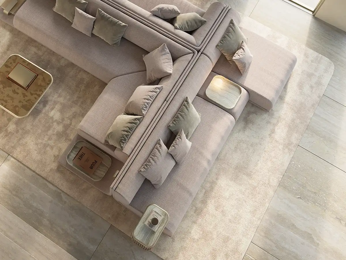 The Marsilio Sectional Sofa by Rossato presents a modular design, adaptable to multiple functions, with brushed gold metal, Perla-colored viscose and linen fabric, and Travertino Romano Classico natural stone. Carefully integrated, it includes discreet lighting and wireless charging, combining advanced technology with maximum comfort.