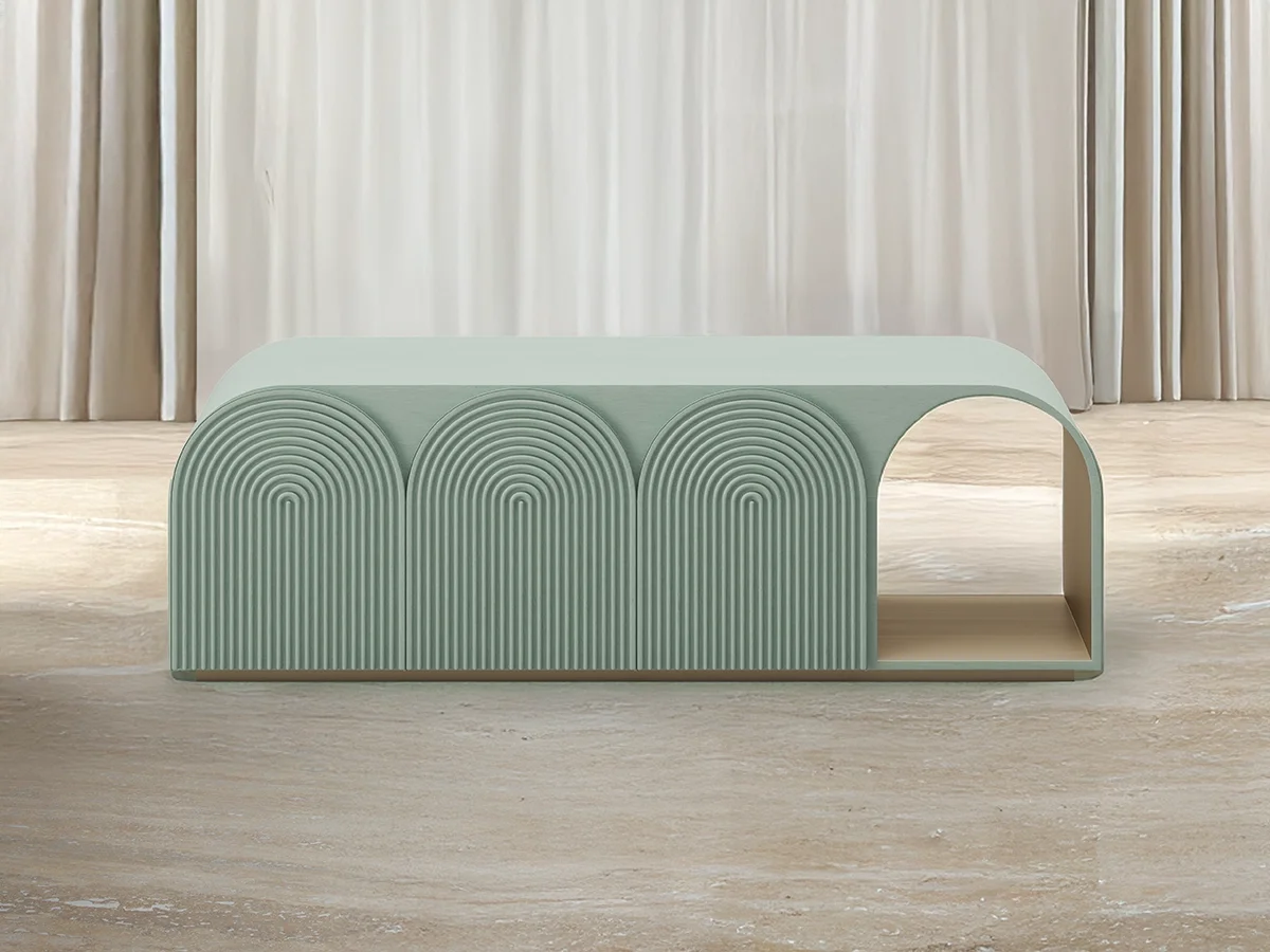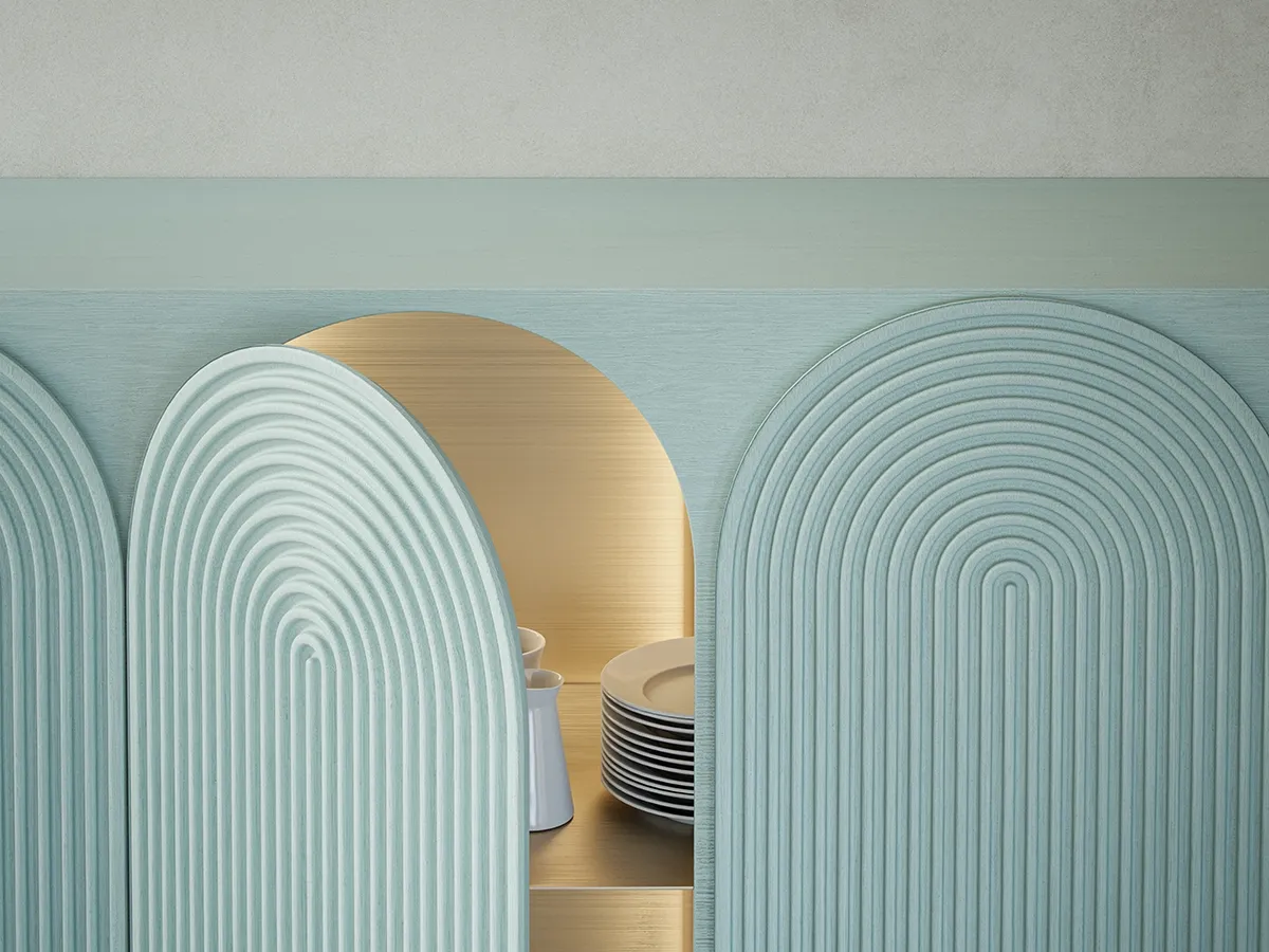The Barnaba Horizontal Low by Rossato pairs through-dyed teal Tay wood, geometric volumes, and low arched modules with brushed gentle gold accents. Designed for flexible horizontal or vertical layouts, it includes an open compartment suited to living areas, while precision-crafted surfaces and galvanized tubing details reinforce structural clarity and echo the arch motif within its overall balanced presence.