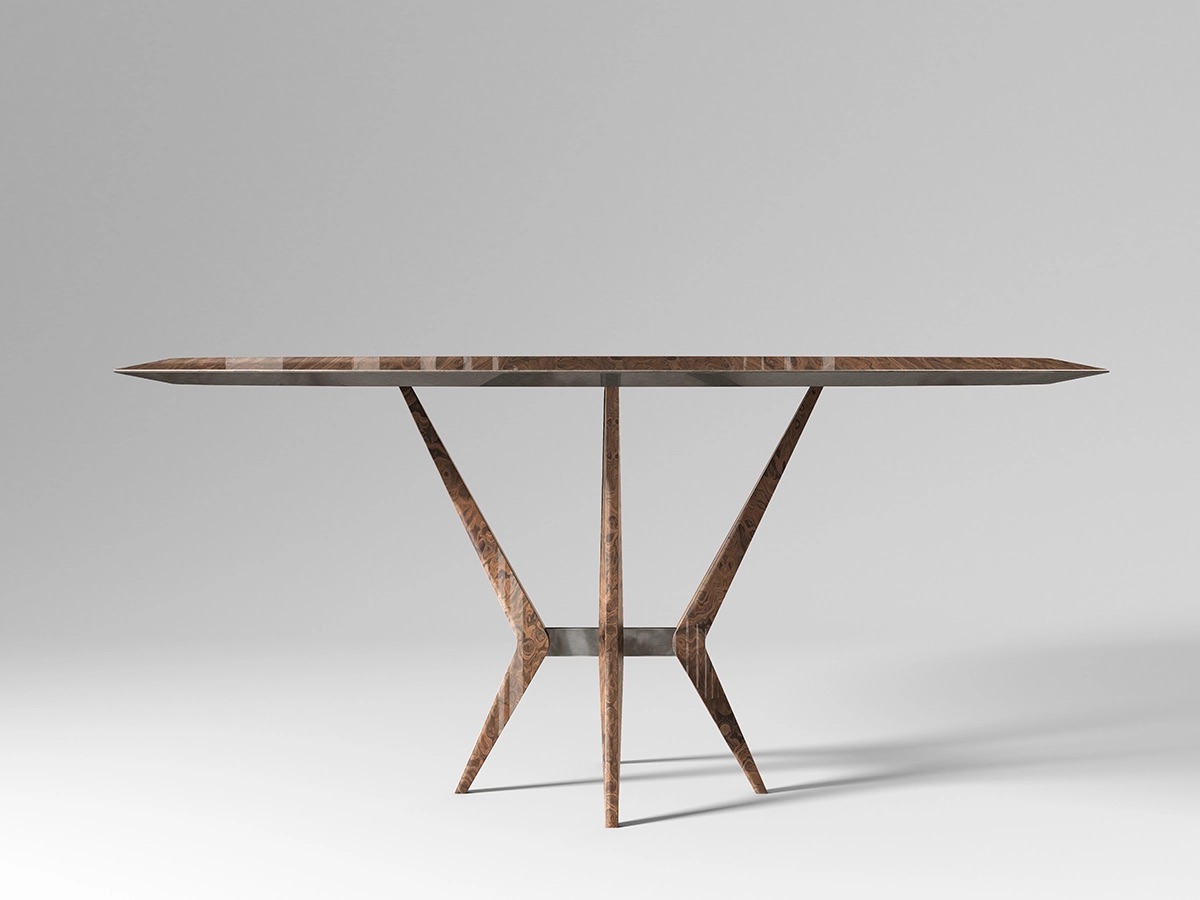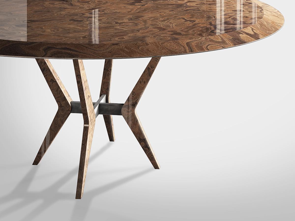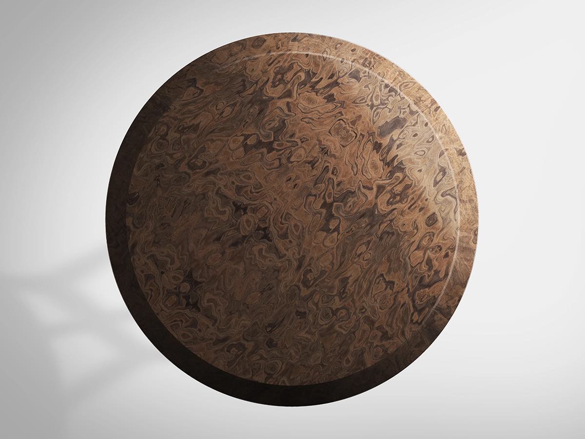 The Bellini Table by Rossato features a large round top, with an upper surface in warm burl veneer and a lower surface in burnished Delabré iron. This alternating combination of materials extends to the geometric structure of the legs, creating a table where elegance, craftsmanship, and refined texture coexist in perfect balance.