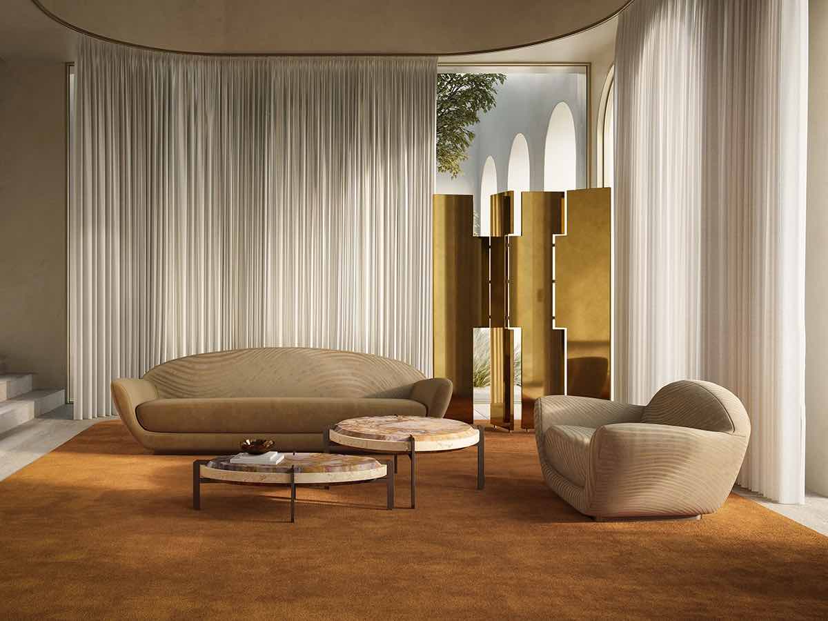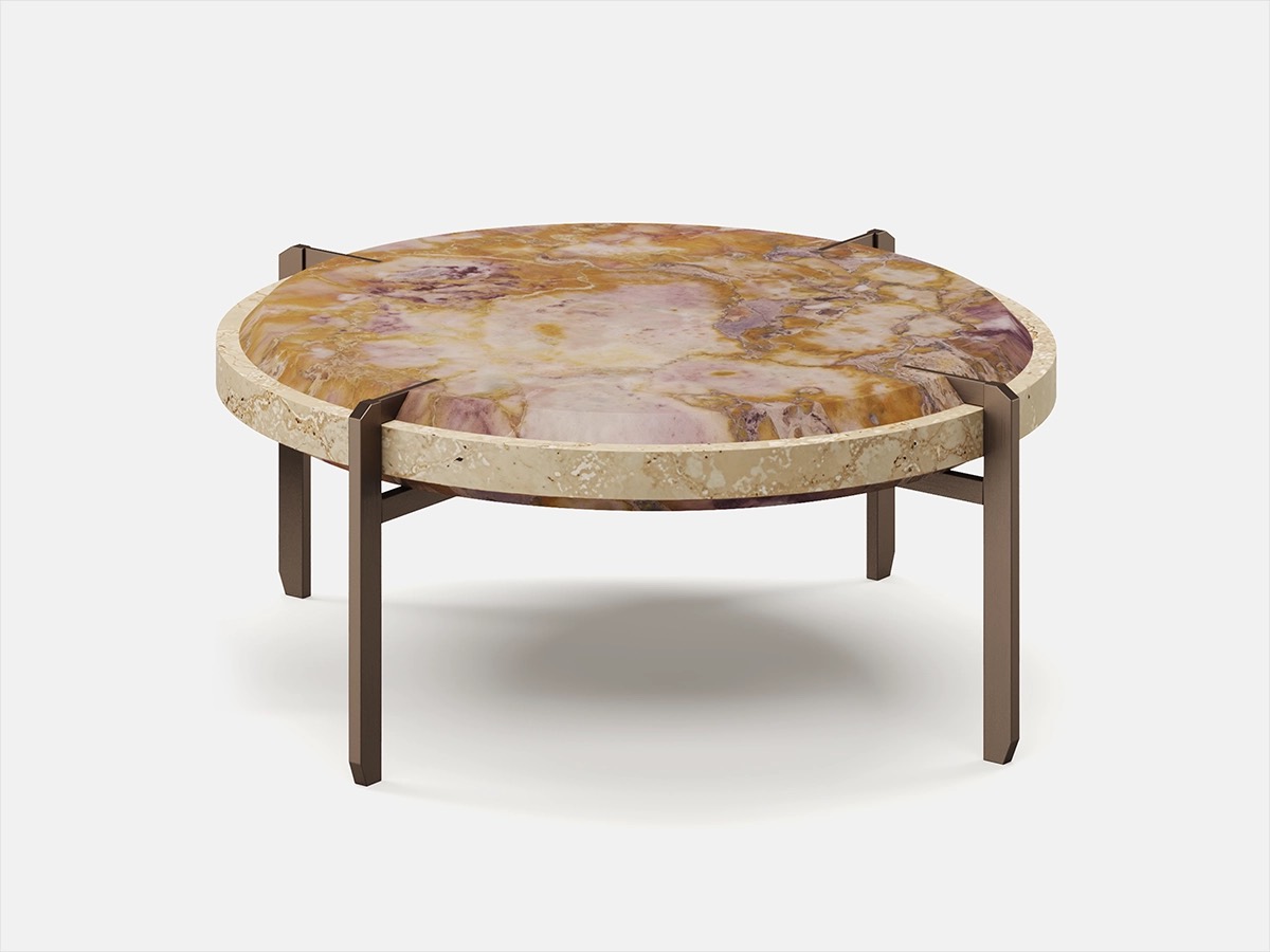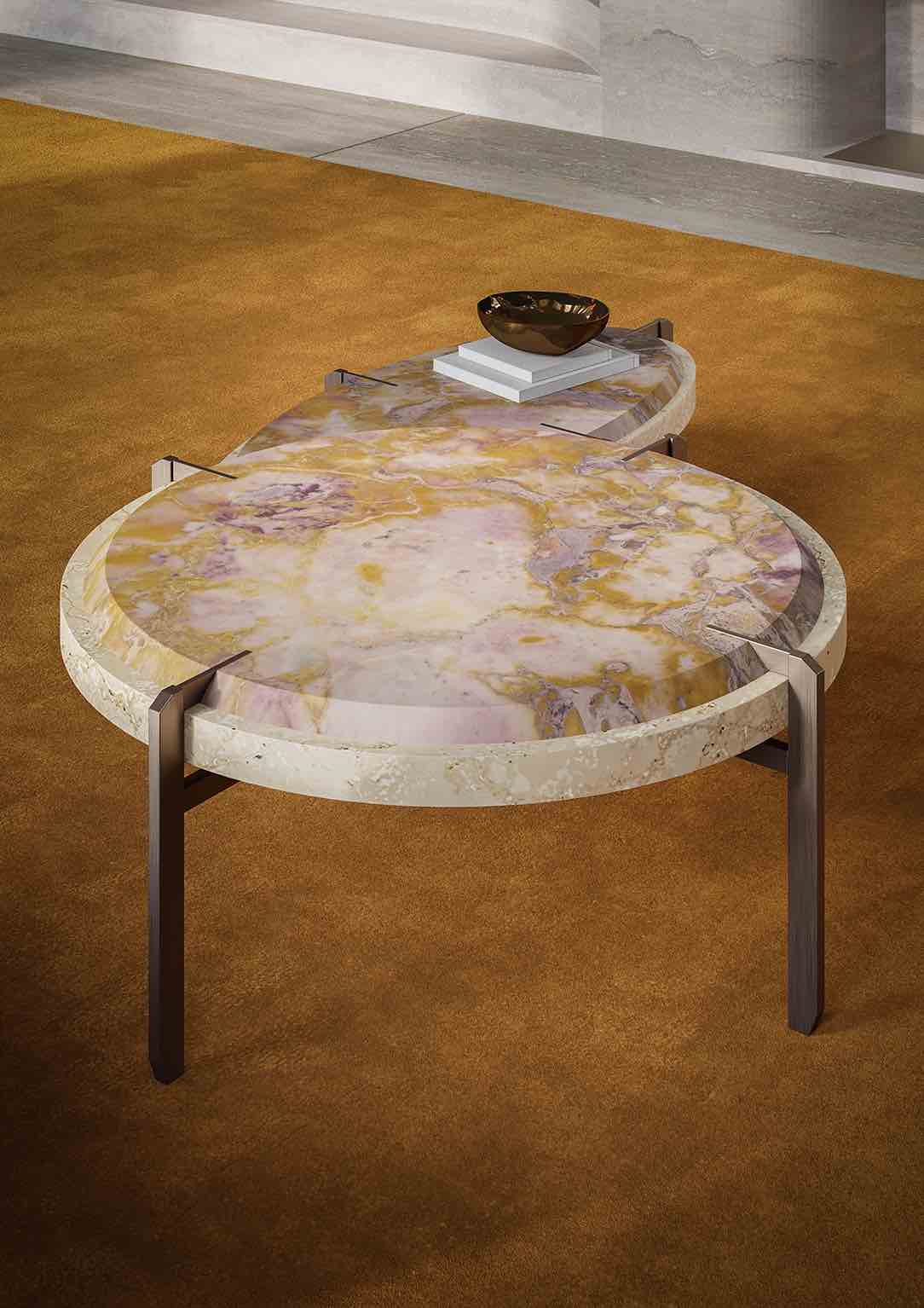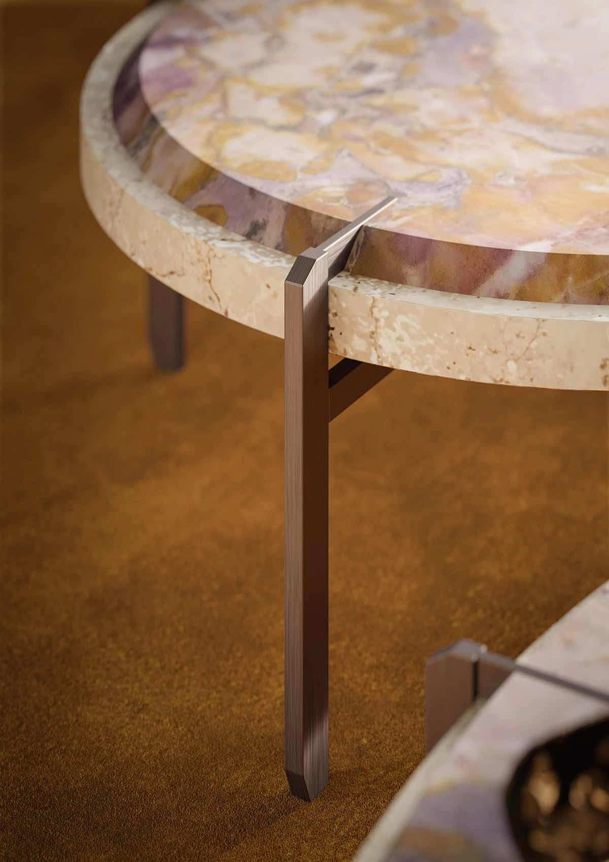 The Cannaregio Round Occasional Table by Rossato features a commanding circular form crafted in refined marble, showcasing a spectrum of light grey and deeper veined tones. Its central section in Travertino Romano Classico and brushed-bronze metal details enhance the composition, giving the table a striking, stage-stealing presence