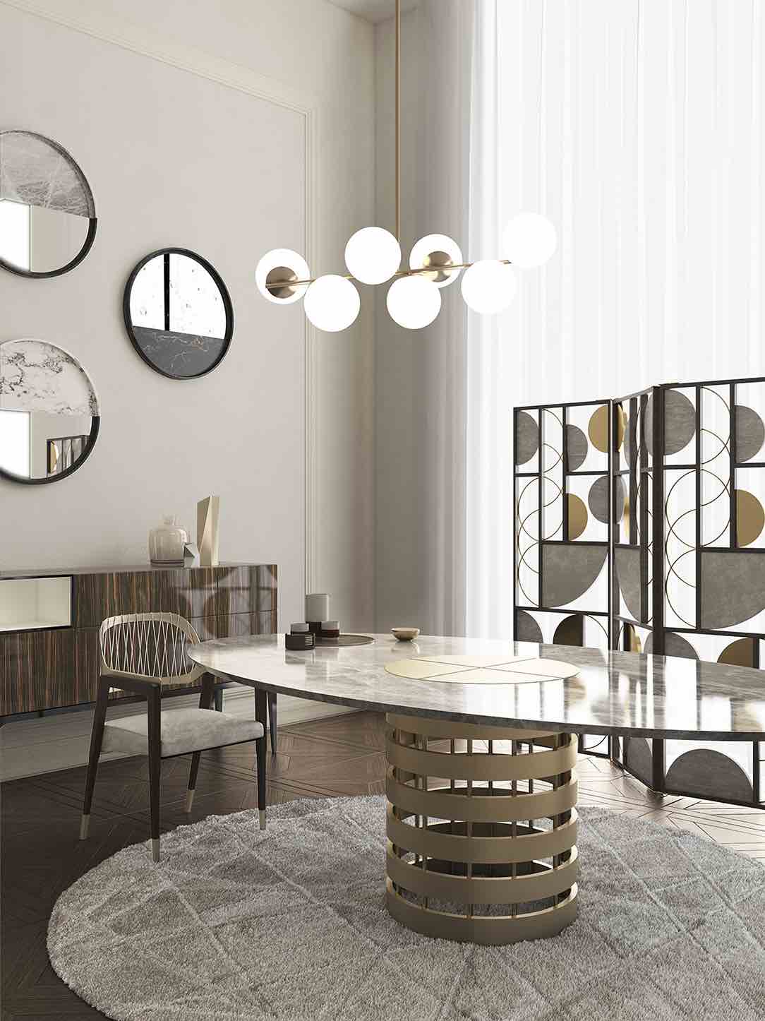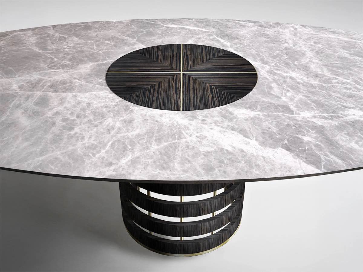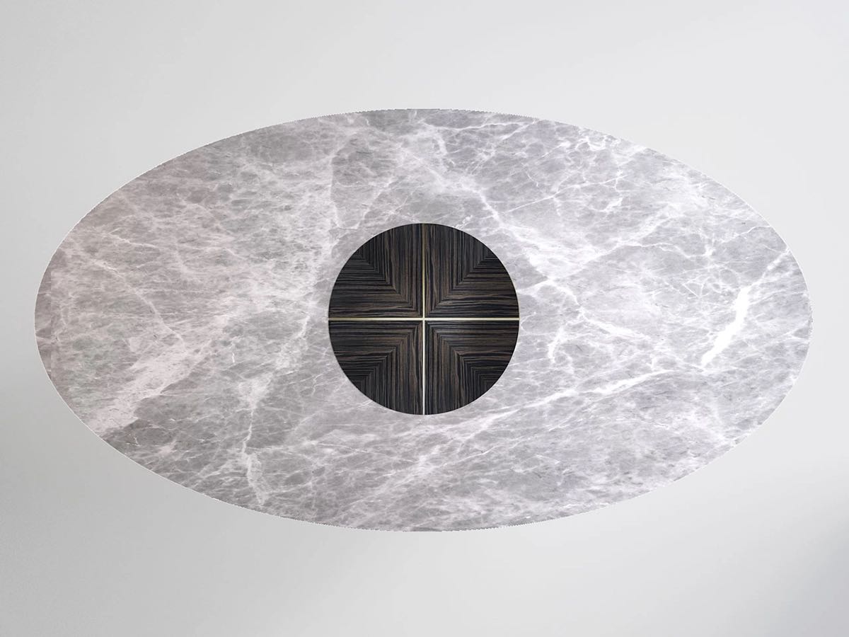 The Conrad Elliptical Large Table by Rossato features a majestic oval top in silver marble with a subtle wax finish, supported by a refined structure of palisander wood veneer and satin brass metal. Luxurious trimmings and thin brass slats echo the top’s motif, while the interplay of solid and open elements creates an extraordinary sense of lightness and elegance.