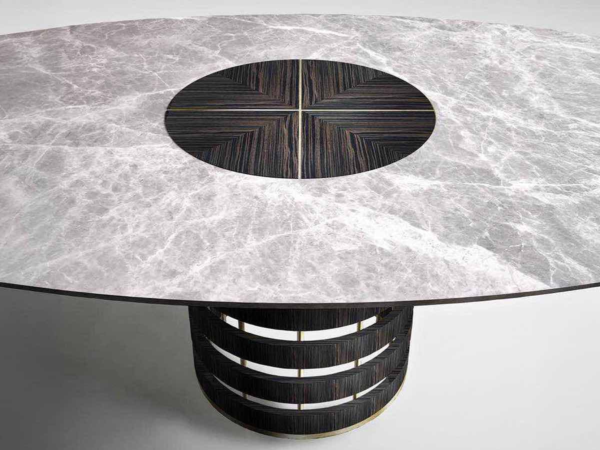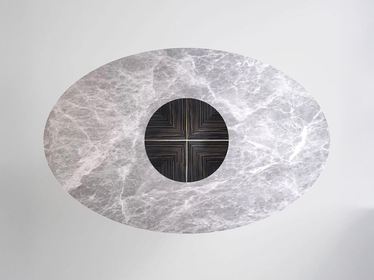 The Conrad Elliptical Small Table by Rossato presents a refined palisander wood–veneer and satin brass structure that supports a compact silver-marble oval top finished with a soft wax sheen. Thin brass slats and elegant trimmings mirror the surface motif, and the balance between open and solid parts lends the piece remarkable lightness and elegance.