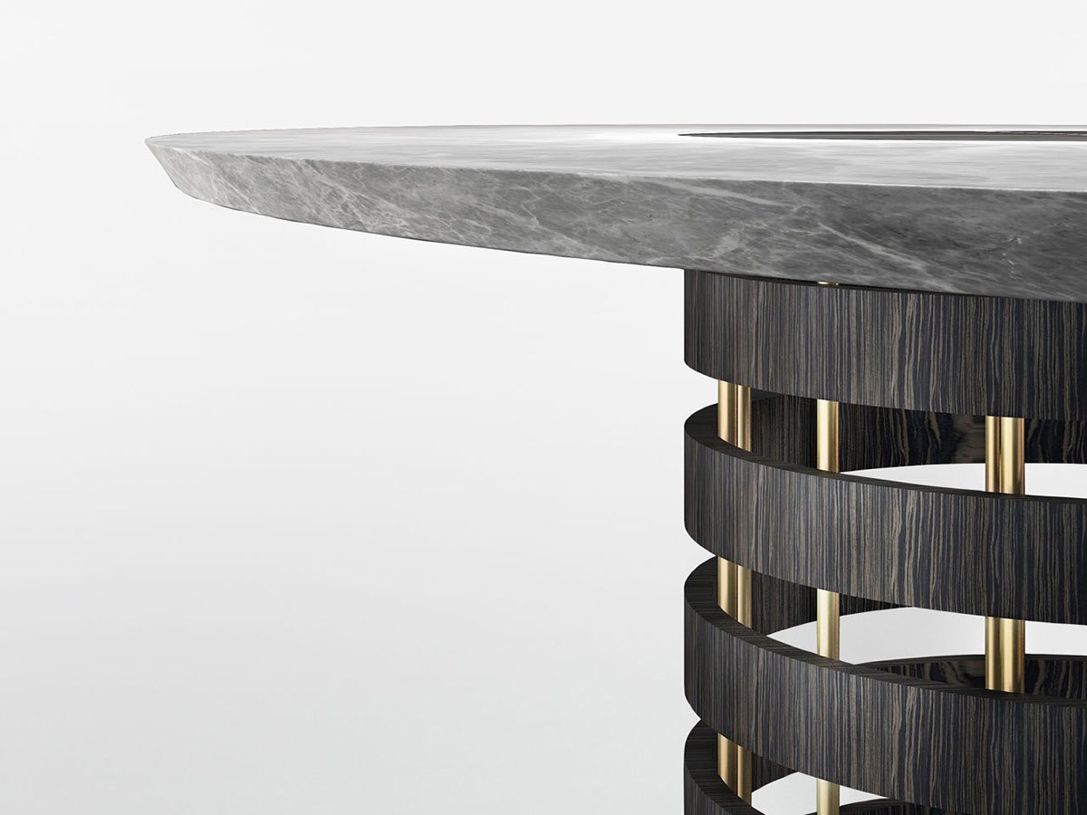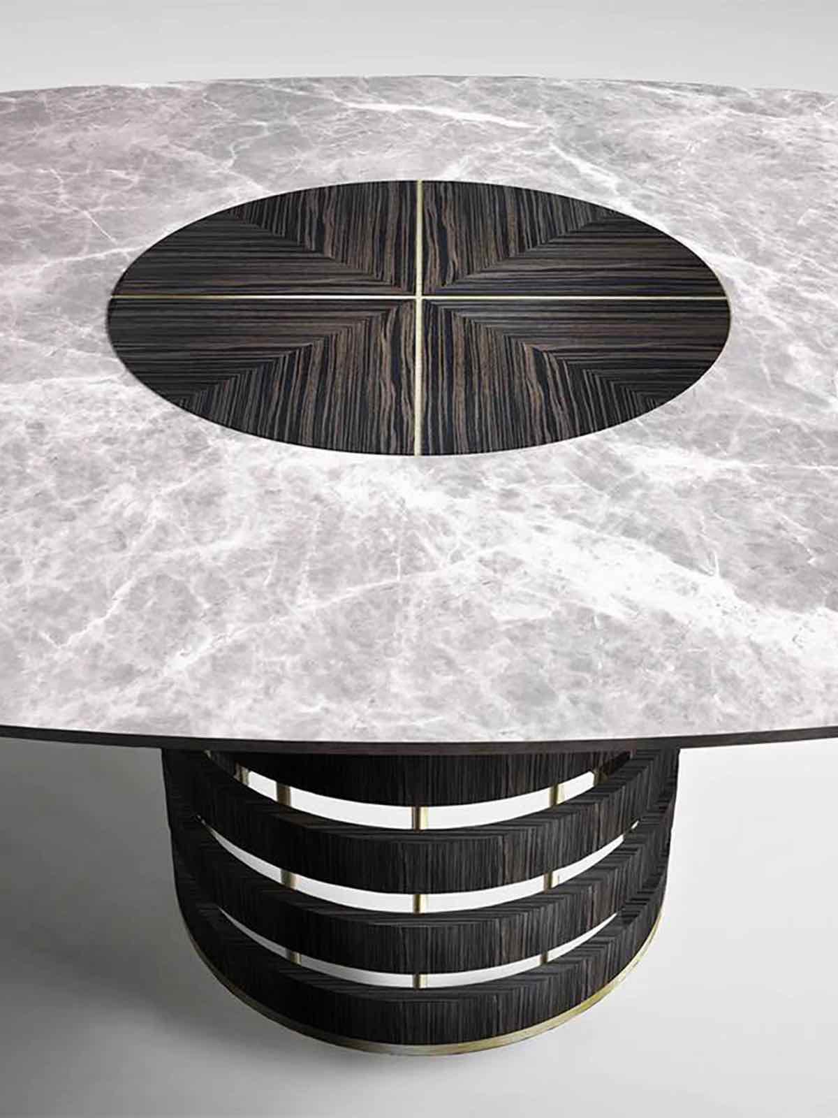 The Conrad Round Table by Rossato presents a refined palisander wood–veneer and satin brass base supporting a grand silver-marble round top, distinguished by a central wood-clad insert and a soft wax finish. Echoed in its thin brass slats and decorative trimmings, the interplay of full and open sections lends the piece exceptional elegance and lightness.