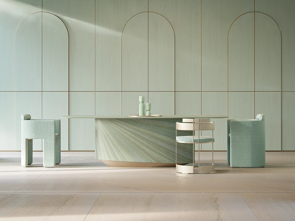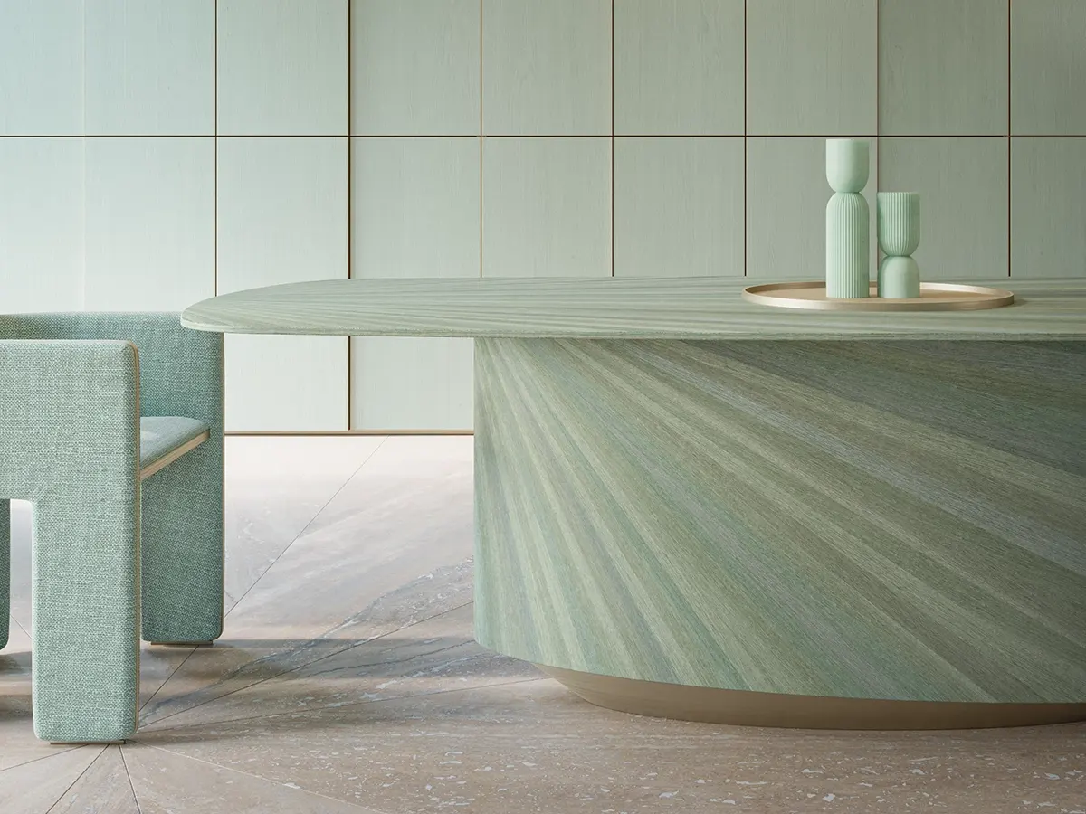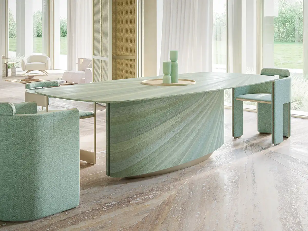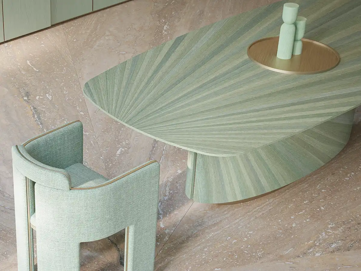 The Dolfin Table by Rossato presents an elliptical base and slender top in brushed gentle gold metal and Tay natural wood, through-dyed in green and teal tones. Inspired by the Venetian gondola, its asymmetrical form and leaf-like inlays merge organic elegance with precise craftsmanship.