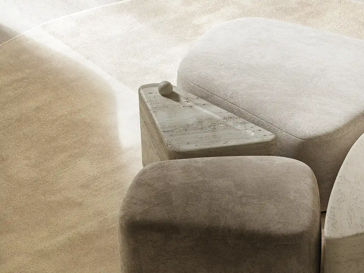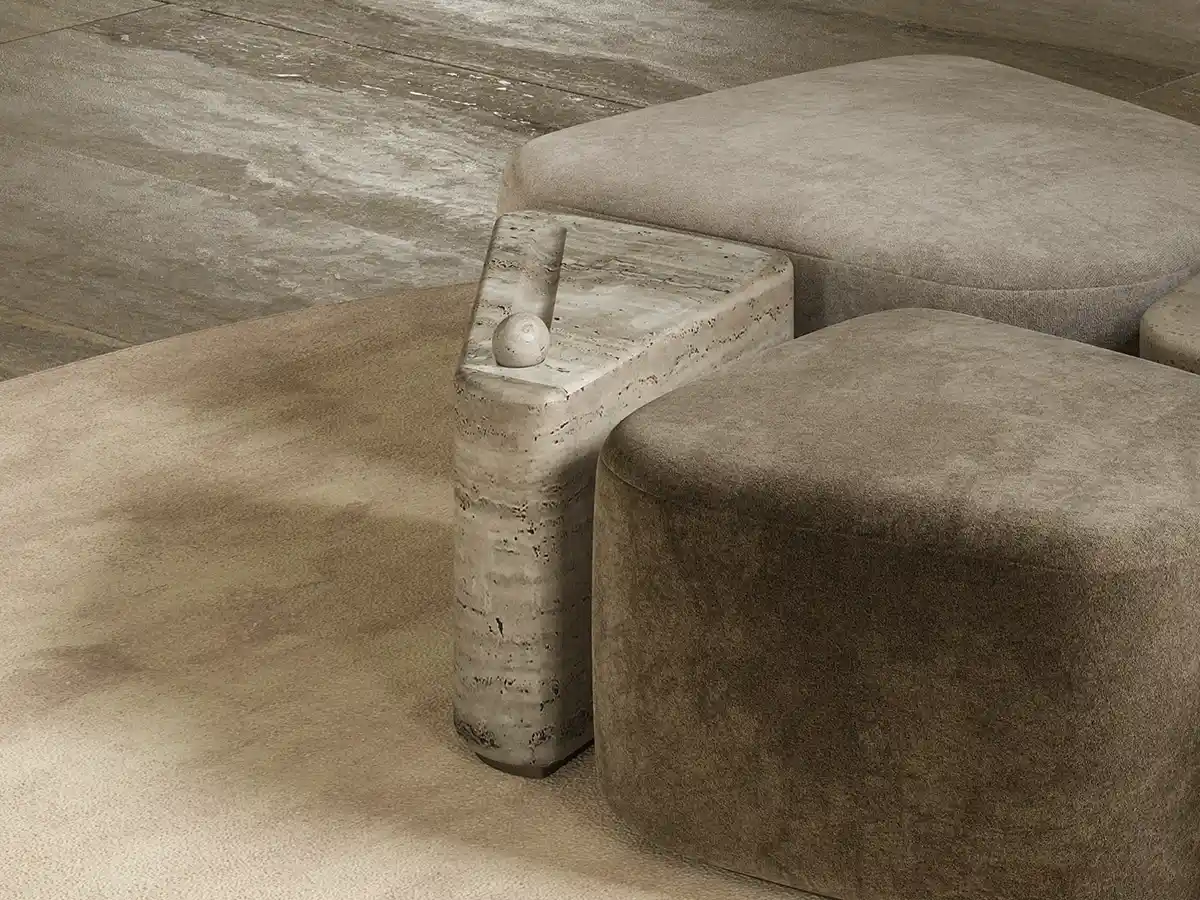 The Fenice Set occasional table 3 by Rossato presents a rounded, modular structure suitable for both indoor and outdoor settings, crafted with gentle gold–brushed metal and finished with a Travertino Silver stone traytop. Drawing on the Spheretrack concept, the piece echoes Palladian floors, where irregular elements align to form a cohesive, elegant, and functional whole.