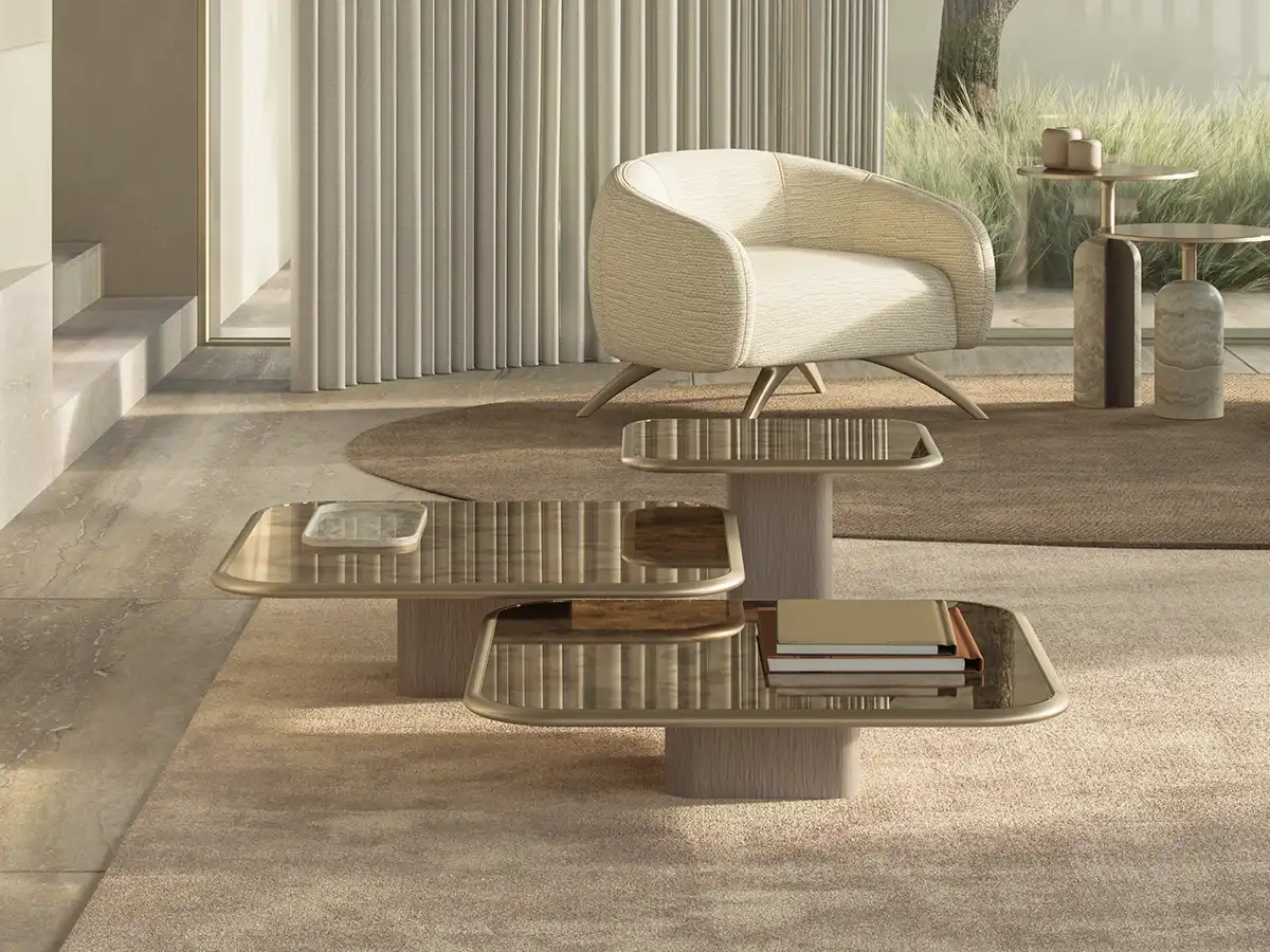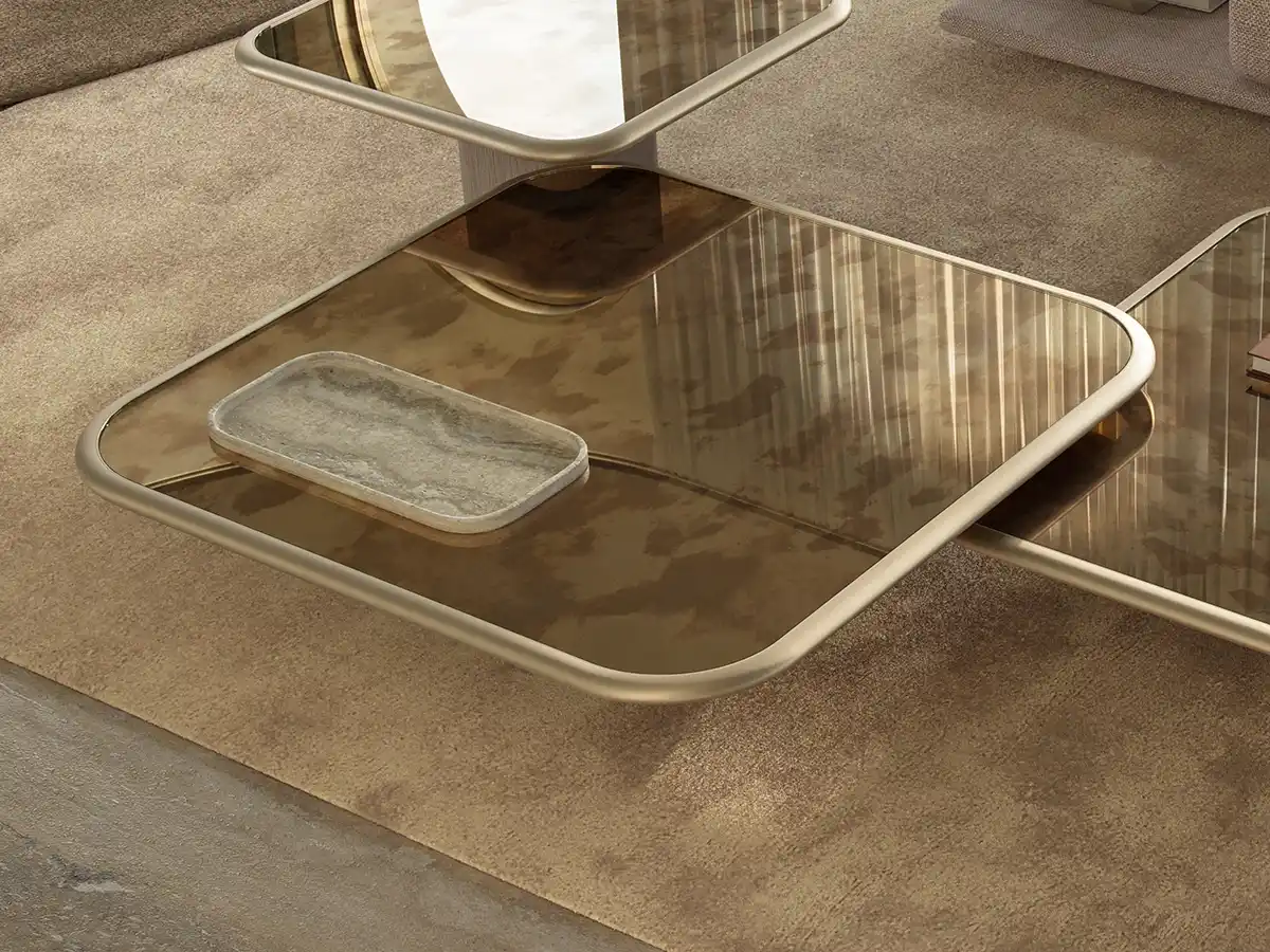 The Tomà Coffee Table – Medium by Rossato presents a modular medium design, crafted from brushed gentle gold metal, through-dyed grey Oak, and Veneziano antiqued mirror. A subtle patina is achieved via acid-etching by Venetian artisans, while satin steel edging strengthens the geometry, granting the table a refined, serene, and striking presence.